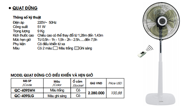 BẢNG GIÁ QUẠT CÂY LIOA CÓ ĐIỀU KHIỂN VÀ HẸN GIỜ QC-409S