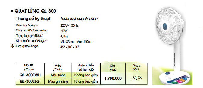 THÔNG SỐ KỸ THUẬT QUẠT LỬNG LIOA KHÔNG CÓ ĐIỀU KHIỂN QL-300E